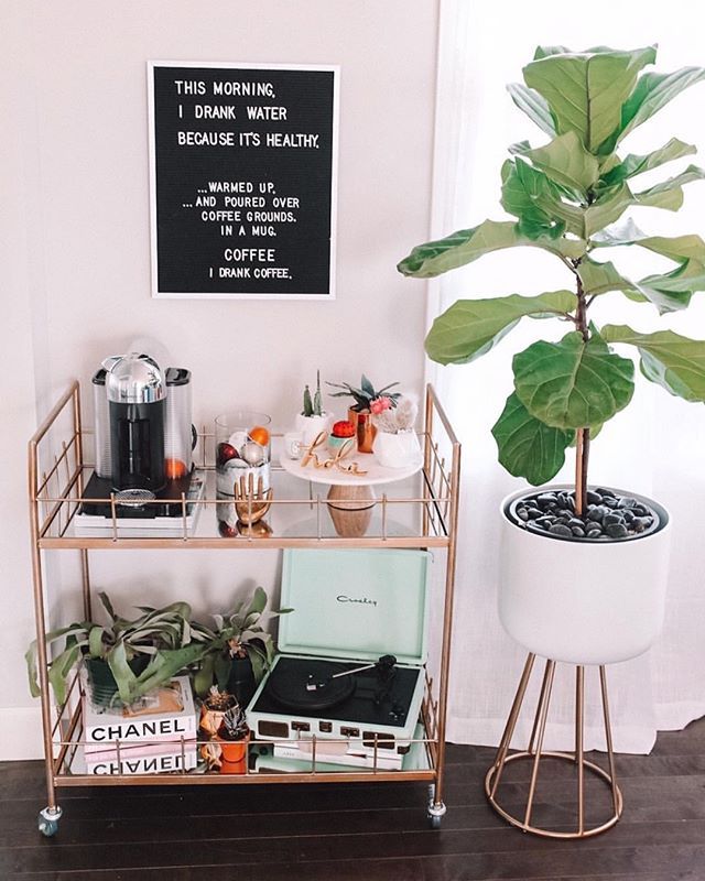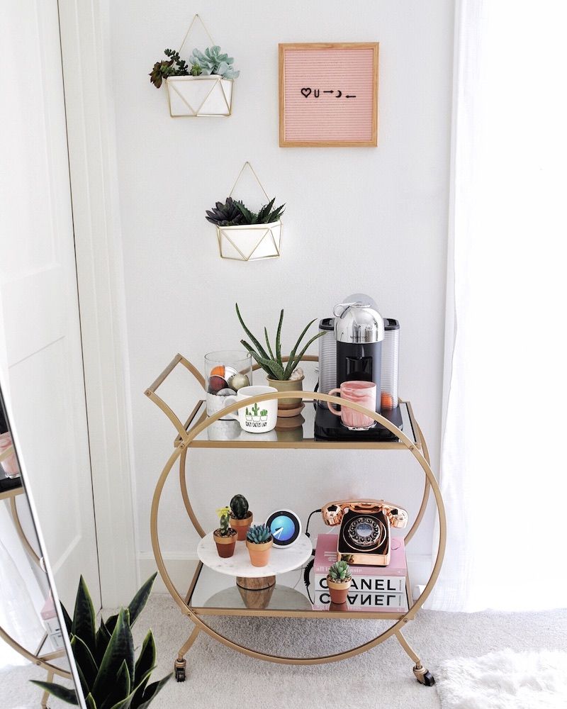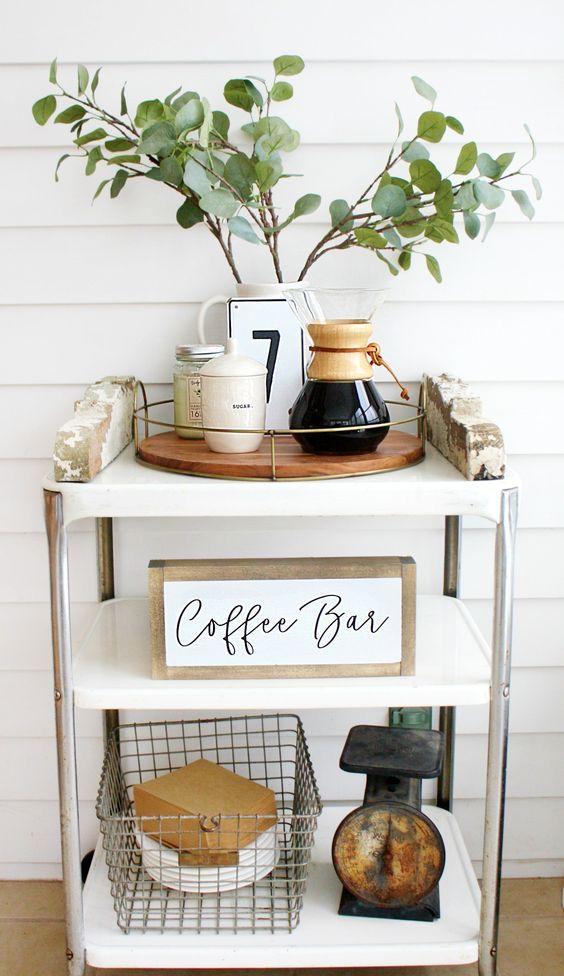 Don’t have any countertop space to spare? A bar cart or small table coffee station is the perfect solution. This approach works in virtually any room, is easy to move when you need more space, and can look absolutely stunning when styled well. Bar carts in particular are incredibly versatile — they come in a range of styles from sleek modern to rustic industrial — and they add a design moment to any corner of your home.