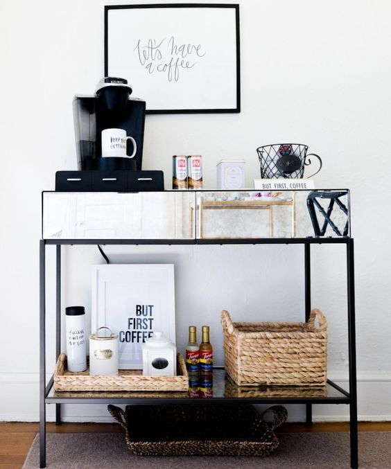 Tables also work beautifully. Narrow console tables, two-tiered accent tables, and even a small dresser-style cabinet can all anchor a coffee station. Browse the inspiration images below for ideas across a variety of styles: